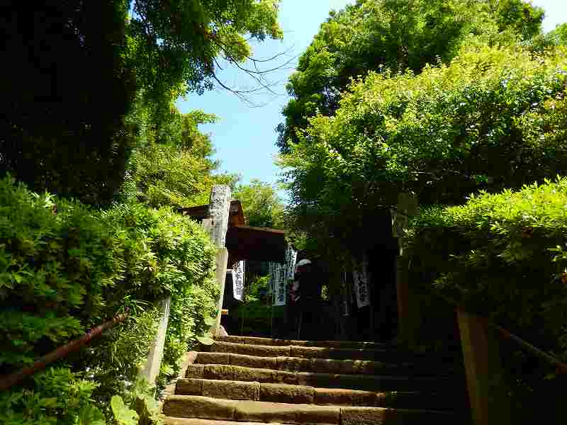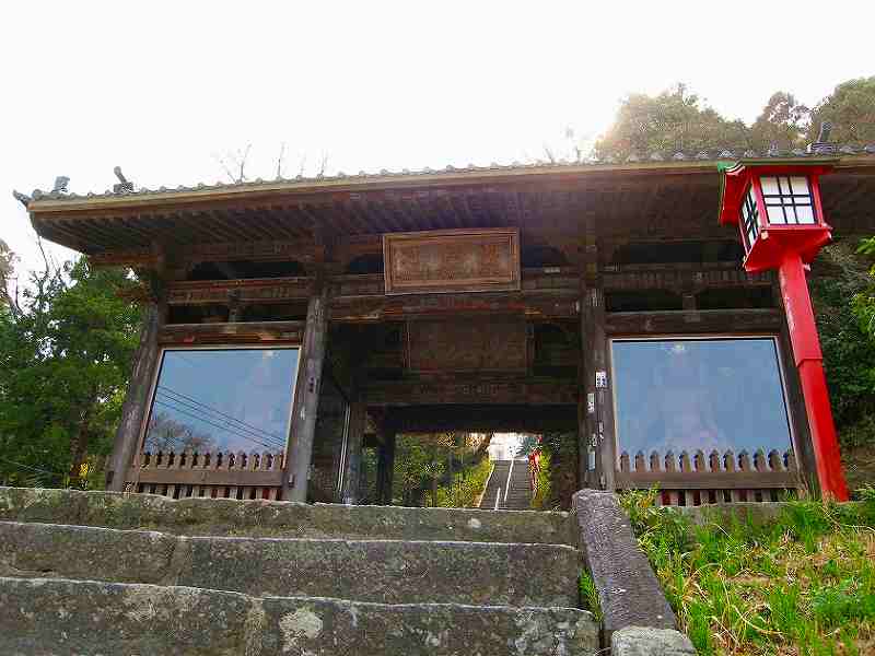 住宅地の先に石段が顕れ、その先に山門が現れる。