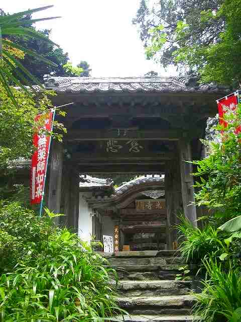 正面の石段を上ると、愚禅和尚の筆になる「施無畏」の扁額をかける仁王門、さらに登りつめると、岩壁に囲まれた五百坪はどの境内に観音堂が建っている。