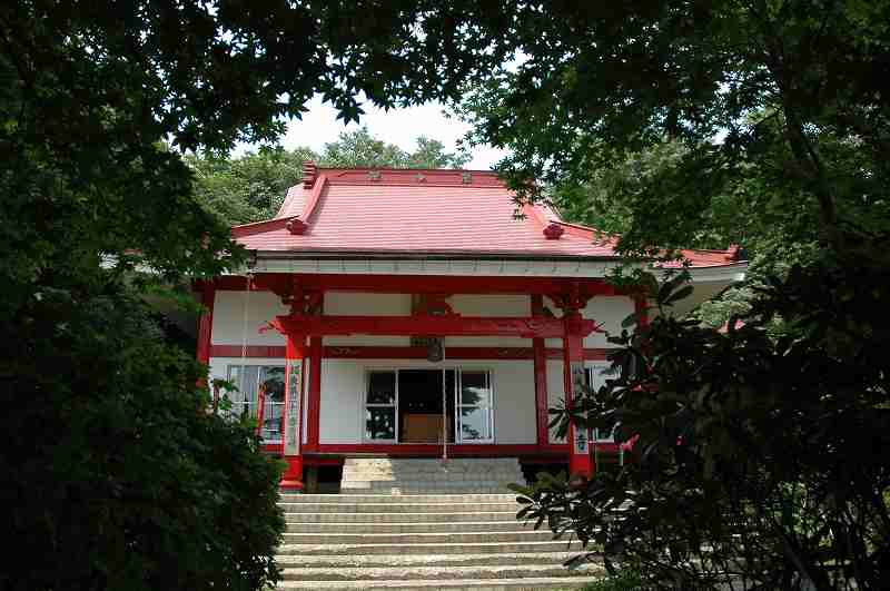 駐車場前面に数段の石段があり、その前面に真っ赤な本堂がある。右手には可也古びた半壊に近い観音堂が有った。
