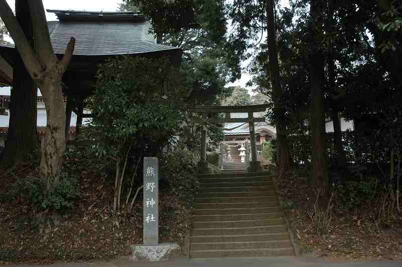 一方は左側に一基だけ「熊野神社」と、もう一方は、右側に「坂東第三十番霊場」と左側に「平野山 高蔵寺」と石柱が二基立つ。
