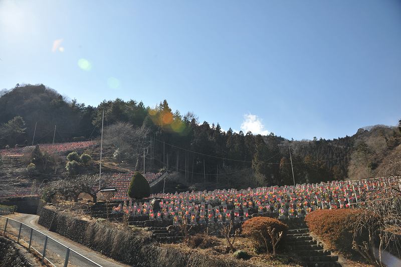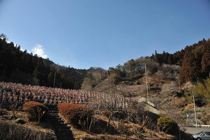道の両側の丘陵一面に、紅い涎掛けを掛けた小さな地蔵様が、幾萬と祀られている。