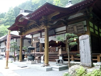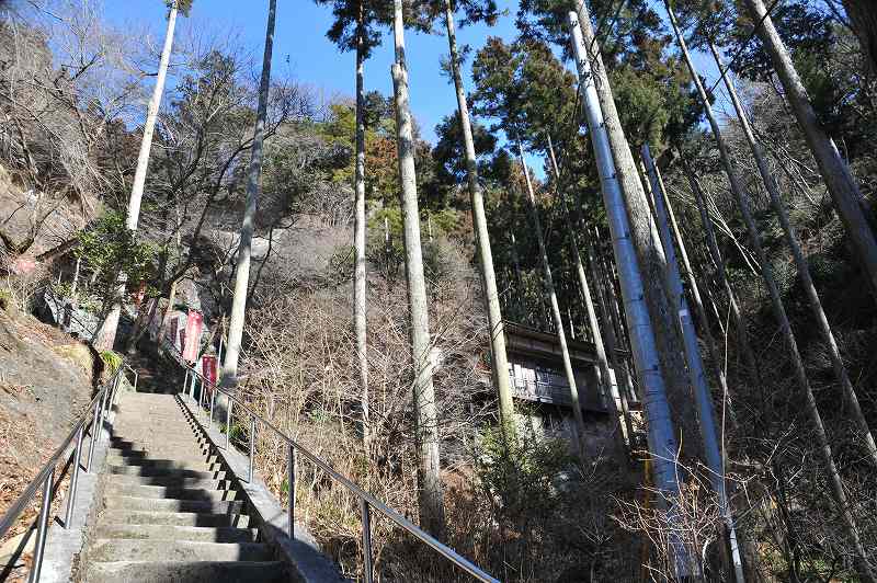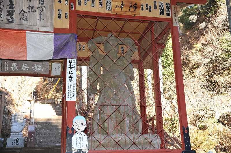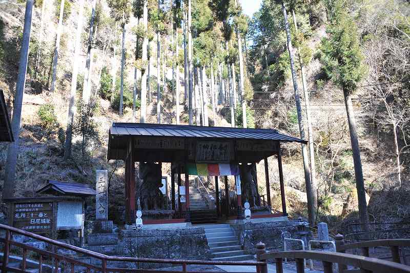 (1868)長野の石工藤森吉弥が奉納した日本一といわれる、台座を含めて四メートルの巨大な石の仁王像が安置されていて、仁王門から長い石段を登り詰めると、三方を岩壁に囲まれた境内に至る。行基菩薩が、自作の観音像を安置したのが始まりとされるが、然し、平将門の乱によって行方がわからなくなっていたものを、後に畠山重忠が鷲の巣のなかから見つけたといわれている。