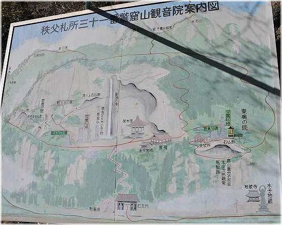 (1800)に書写された『武州秩父郡御札所之縁起』および、『秩父三十四箇所順礼観音縁起』も蔵している。法性寺本堂から懸崖造の観音堂までは、百メートルほど離れていて、嘗ては鎖場だったという。岩を削ったままの段を上り、床下を通って背後から堂内に入る。