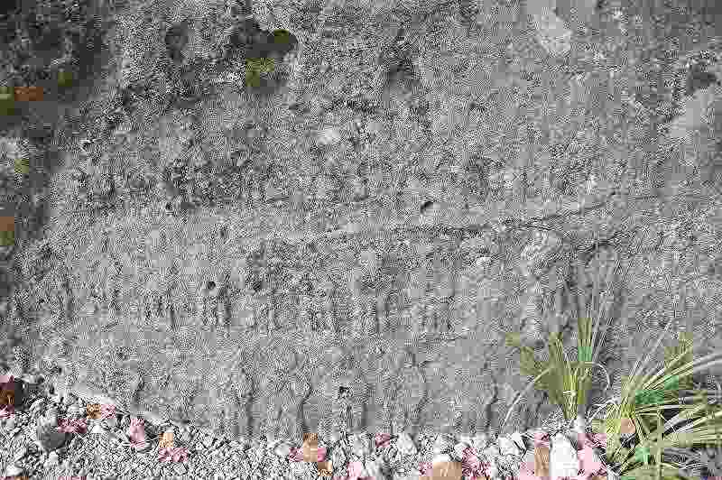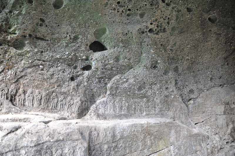 目の高さの岩壁には、身の丈三寸ほどの多数の磨崖佛がある。