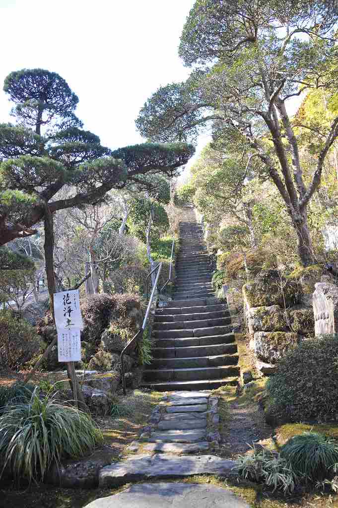 仁王門を潜ると296段の急な石段が続く。石段の途中には、歌碑と、朧気に写真正面に見えるのが鐘楼、その先が本堂、右手に見えるのが庫裏である。