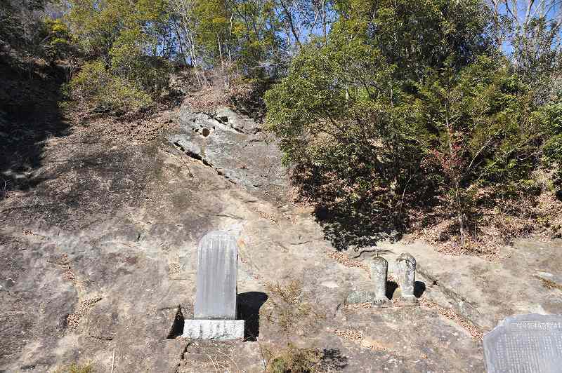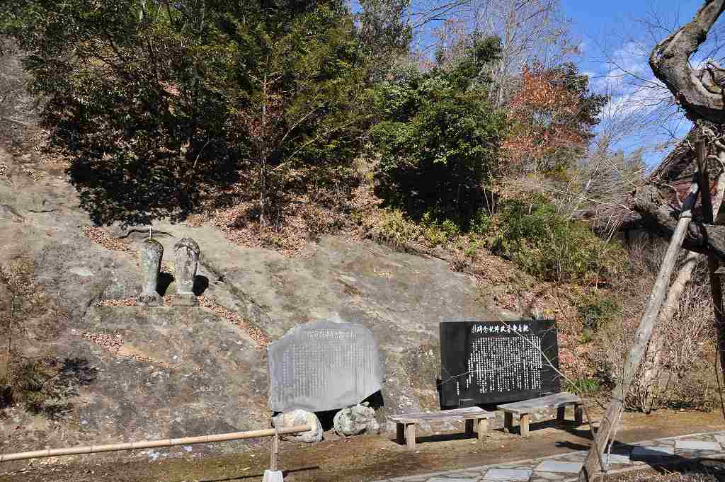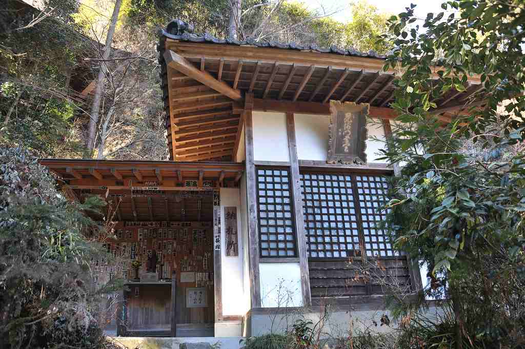 本堂の脇手には、詩碑や石仏が祀られ、見上げると、懸崖造りの観音堂と、もう一棟が見える。
