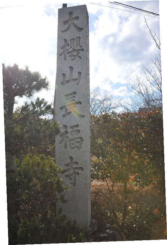 菊水寺の参道前には、「大櫻山長福寺」の大きな石柱が立っている。別当の長福寺は、長山賢道