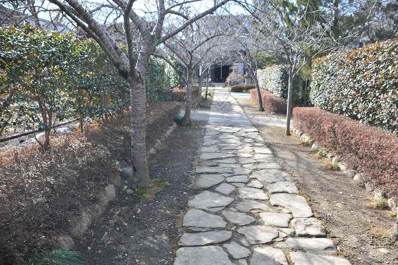 この坂道を歩いて行くと寺の境内に出る。