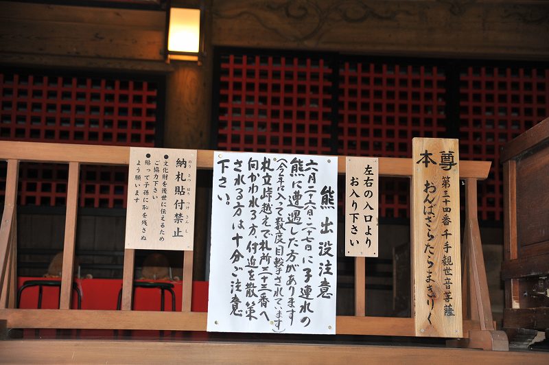 寺域はとても広いようで、道は続いてるが、本殿前には熊出没の注意書きが有り、今年になってからも目撃されているようで、通行止めの注意書きがある。