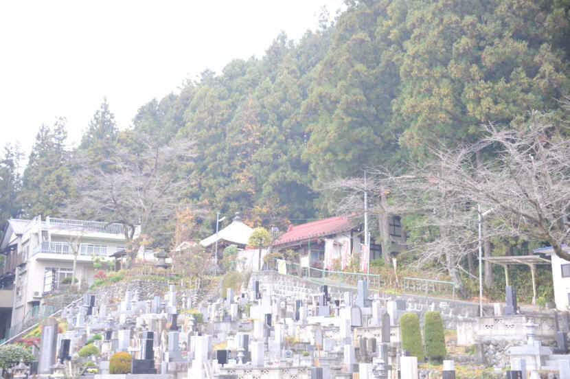案内板に従って右に折れ、緩やかな坂を上ると、左手三尺ほど下に墓地と駐車場、右手の高台に寺が樹木の間に見える。