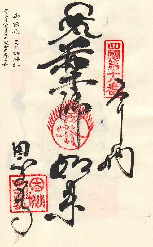 やがて母君は剃髪をして、その髪を奉納されたので、大師は山号寺名を「母養山恩山寺」と改め、自像を彫造して安置され「我が願いは末世薄福の衆生の難厄を除かん」と誓われ、弘仁5年(814)ころのことと伝えられる。