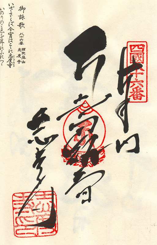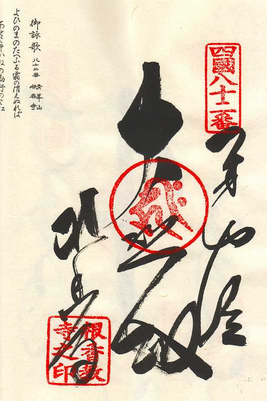大同年間に弘法大師が来錫し、三尺五寸の立像の聖観世音菩薩を刻んで本尊とし、行基菩薩が建立した堂塔を補修、伽藍を再興、そして四国第八十三番札所と定められた。