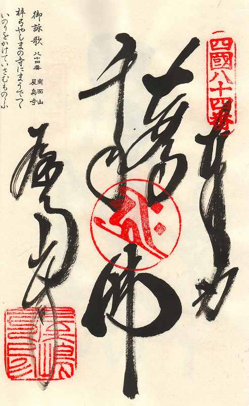 志度寺から凡そ七`に88番札所がある。途次長尾の古い町並になり、寺は町中にあり、弘安六年と九年の銘のある石の経幡を拝みながら仁王門を入ると、広い境内に本堂、右に大師堂、左に護摩堂と常行堂が建ち並ぶ。