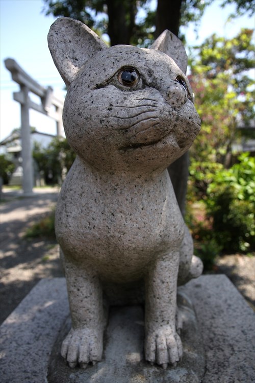 愛猫の無事や健康を祈る「猫絵馬・猫守り」を授与しており、「ただいま猫」の石像がある。
