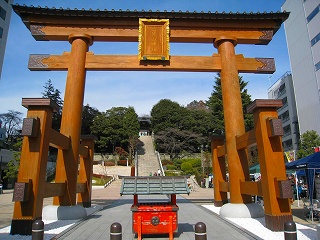 鳥居 樹齢400年の栃木県産のケヤキを用いた、高さ9.7m、幅13.8m、柱の直径90cmの大鳥居。江戸時代の同神社の両部鳥居を復元したものである(以前の明神鳥居は1946年12月に建てられた)。2008年10月12日、建て替えられた鳥居の竣工式が行われた。
