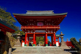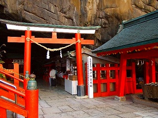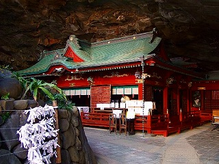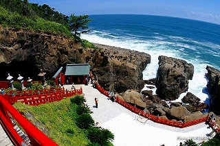 鵜戸神宮は、宮崎県日南市にある神社で、日向灘に面した断崖の中腹、東西38m、南北29m、高さ8.5mの岩窟(海食洞)内に本殿が鎮座し、参拝するには崖にそって作られた石段を降りる必要があり、神社としては珍しい「下り宮」のかたちとなっている。