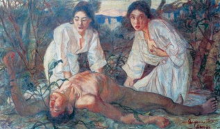 上の絵は、青木繁という明治の画家がキサガイヒメとウムギヒメを描いたものである。