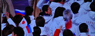 日本の選手団は、代表は大きな日章旗を掲げ、団員は開催国に敬意を払って、日本の小旗とロシアの小旗を振って行進した。