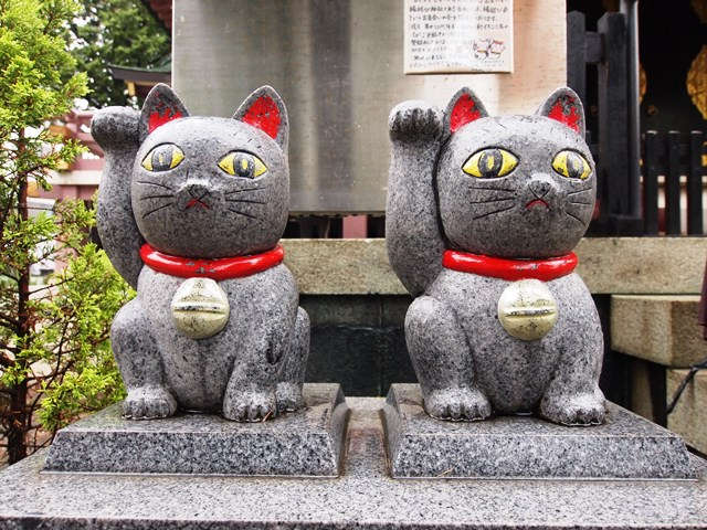 本殿や境内に安置されている招き猫の形状は江戸明治の今戸焼の招き猫とは形状の全く異なるものなので、考証的には伝統的なものとの関わりのない平成の創作として見る必要がある。