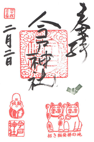 これが招き猫の発祥ともいわれているが、当時の記録では具体的に招き猫と今戸神社(旧今戸八幡)との結びつきを示すものは確認されていない。