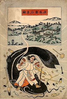 また武甕槌大神は鹿島神宮の主神として祀られていることから鹿島神とも呼ばれ、鯰絵では、要石に住まう日本に地震を引き起こす大鯰を御するはずの存在として多くの例で描かれている。