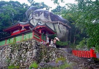 この岩の根元を支える袈裟岩と言われる岩の周辺では、経塚が発見されており、其処では平安時代の経筒が多数発掘され、そのさらに下層からは銅鐸片や滑石製模造品が出土していることから、神倉神社の起源は磐座信仰から発したと考えられている。